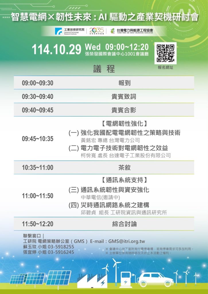 公佈欄 協會活動公告 最新消息 智慧電網 × 韌性未來:AI驅動之產業契機 2025 年 10 月 4 日 tp2e 本研討會將邀請台電公司、台達電、中華電信等產研專家分享實務案例,期盼透過跨界交流,共同探索打造具韌性與智慧化的電力系統,竭誠邀請您報名參加。 活動資訊 活動時間2025年10月29日(週三)上午9:00-12:20活動地點張榮發基金會國際會議中心1001會議廳(臺北市中正區中山南路11號10F)報名連結https://www.surveycake.com/s/e2AQq主辦單位工業技術研究院、台灣電力與能源工程協會聯絡窗口工研院電網管理策略室(GMS)E-mail:GMS@itri.org.tw 蘇小姐03-5918255/張小姐03-5916245 活動議程資訊